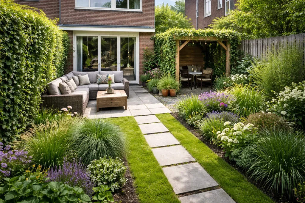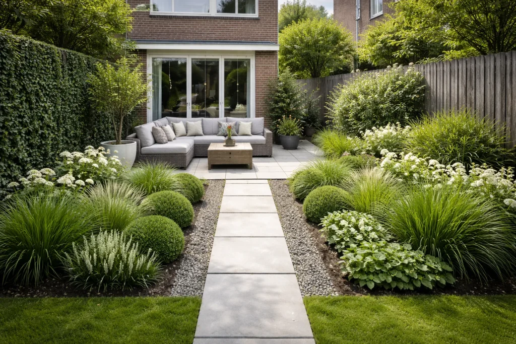 Meestal werkt een 3-zone indeling het best: zitplek bij huis, groenbuffer in het midden en opslag/eindpunt achterin. Het houdt de tuin logisch en rustig.