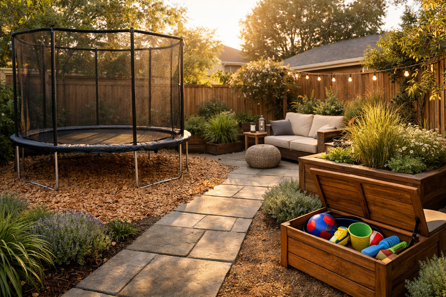 - Herhaling in lijnen: als je tuin visueel rustig is, voelt hij groter—ook als er een trampoline staat.