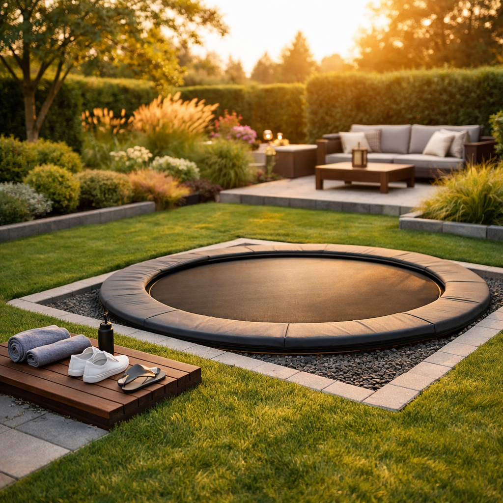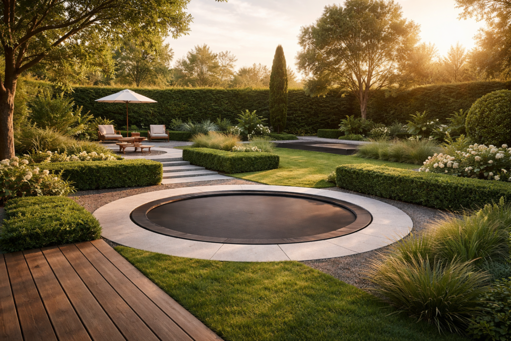 - Werk met randen en niveauverschil: een trampoline oogt rustiger als hij aansluit op het maaiveld en de omgeving een duidelijke rand of overgang heeft.