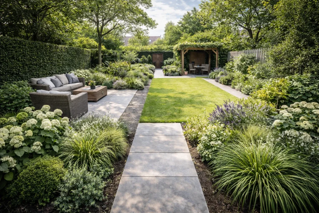 Door vanaf het begin te ontwerpen met “droog vs. nat” en “rennen vs. relaxen” voorkom je dat de tuin chaotisch aanvoelt.